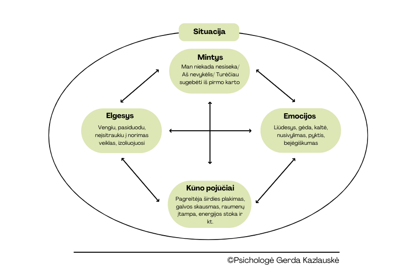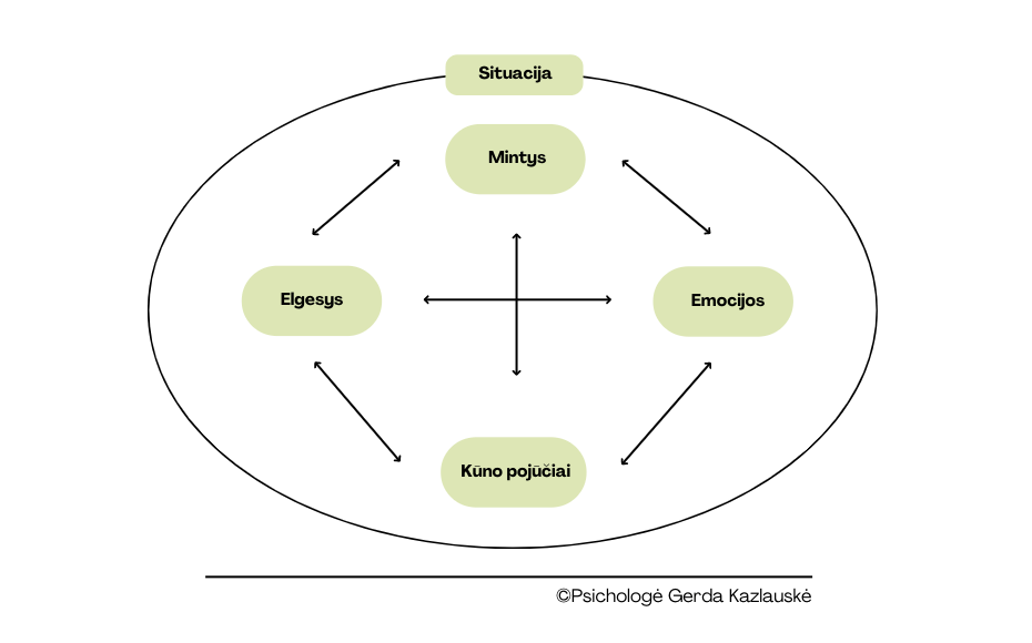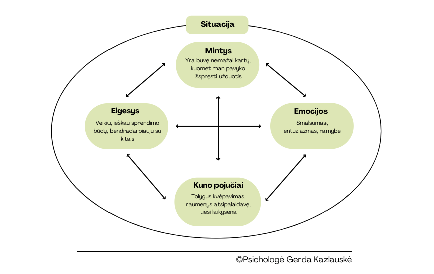 Pakeitę bent vieną iš elementų pvz. savo mintis (mąstymą) - paveikiame ir kitus elementus - emocijas, kūno pojūčius ir elgesį.
